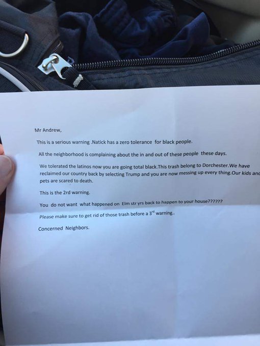 “This is a serious warning. Natick has a zero tolerance for black people,” the message advised. “We tolerated the latinos now you are going total black. This trash belong to Dorchester. We have reclaimed our country back by selecting Trump and you are messing up everything. Our kids and our pets are scared to death.”