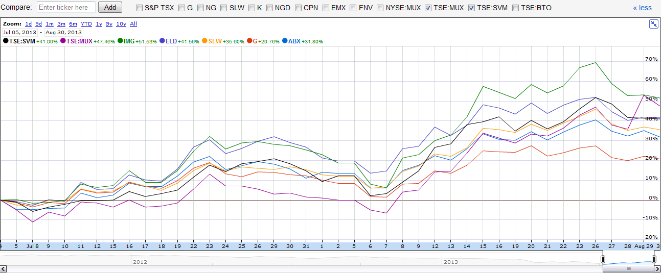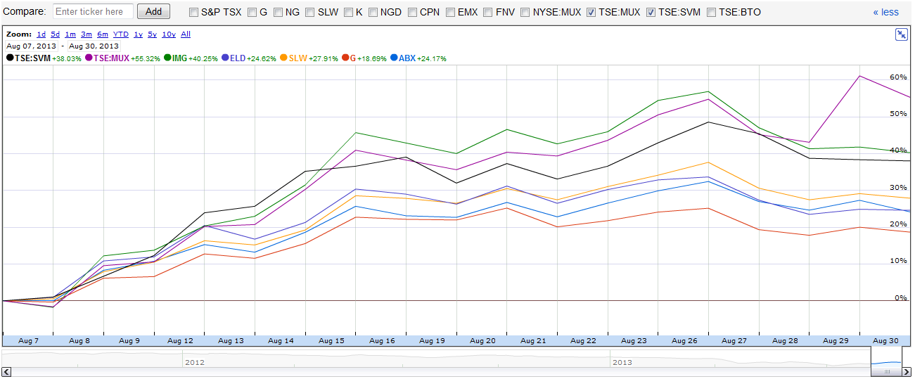 I am looking to buy for a midcap miner which is more liquid than the juniors (ie MUX, SVM and others) on the Canadian exchange. Looking at the relative performance of the miners during the last rally, IAMGOLD seems to be one that not only outperforms most others percentage-wise but also has deeper pullbacks. So I am considering buying IAMGOLD (IMG on the TSX) for short term trading. Again this is for those looking to trade shares on the Canadian exchange.