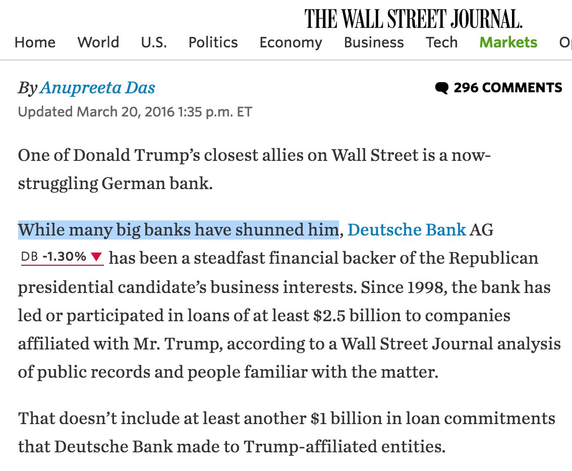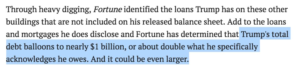 From Forbes and WallStreetJournal, Trump is billions of dollars in debt to foreign banks. one of the most under-reported story in 2016.