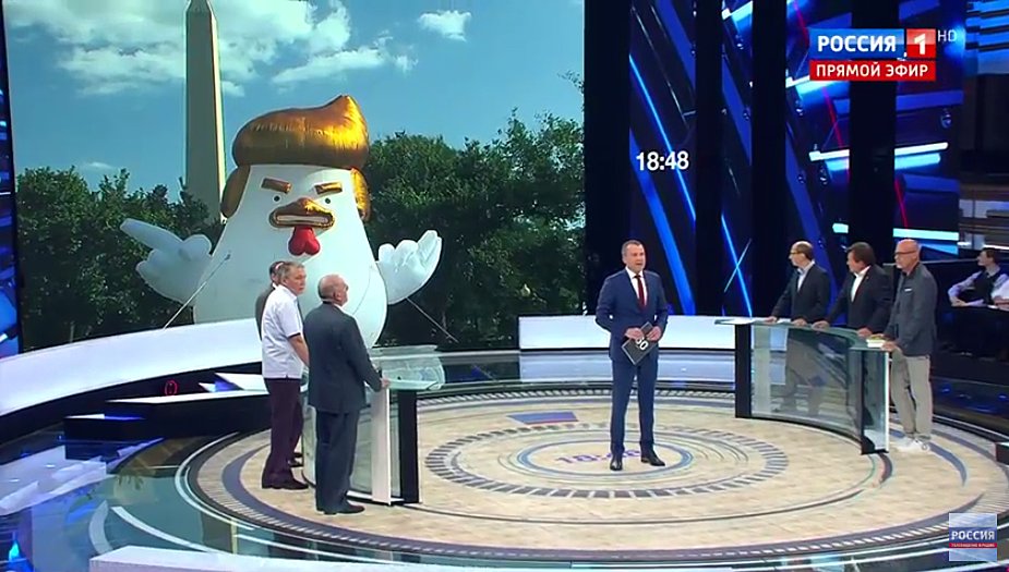 #Russia's state TV: Russian lawmaker says that inflatable chicken by the White House is an accurate representation of #Trump vs #NorthKorea.