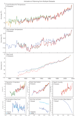 FacebookTwitterPinterest Nine signals of a changing climate. Illustration: USGCRP Climate Science Special Report The top chart is shown as a temperature “anomaly,” which means a departure from normal. Right now the anomaly is nearly 2°F, meaning that we have warmed 2°F from what the normal temperature should be. The graph shows four datasets, so it doesn’t matter whose temperature data we use; the results are the same. Global land-air temperatures have been rising pretty steadily since approximately 1960.