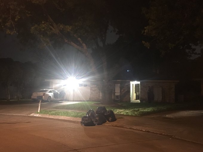 Officer guarding front door. Car door still open—how woman left it when suspect grabbed her purse. Police say she told them she shot 3x into air to scare suspects off. Appears no one was hit. #abc13