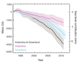 The mass increase component is driven by melt of ice on land which is a function of the temperature at the surface of the ice. We know that the increases in surface temperature have been strongest in the Arctic, but we can also look directly at the decrease in land ice. Satellites are useful. That's been plunging.