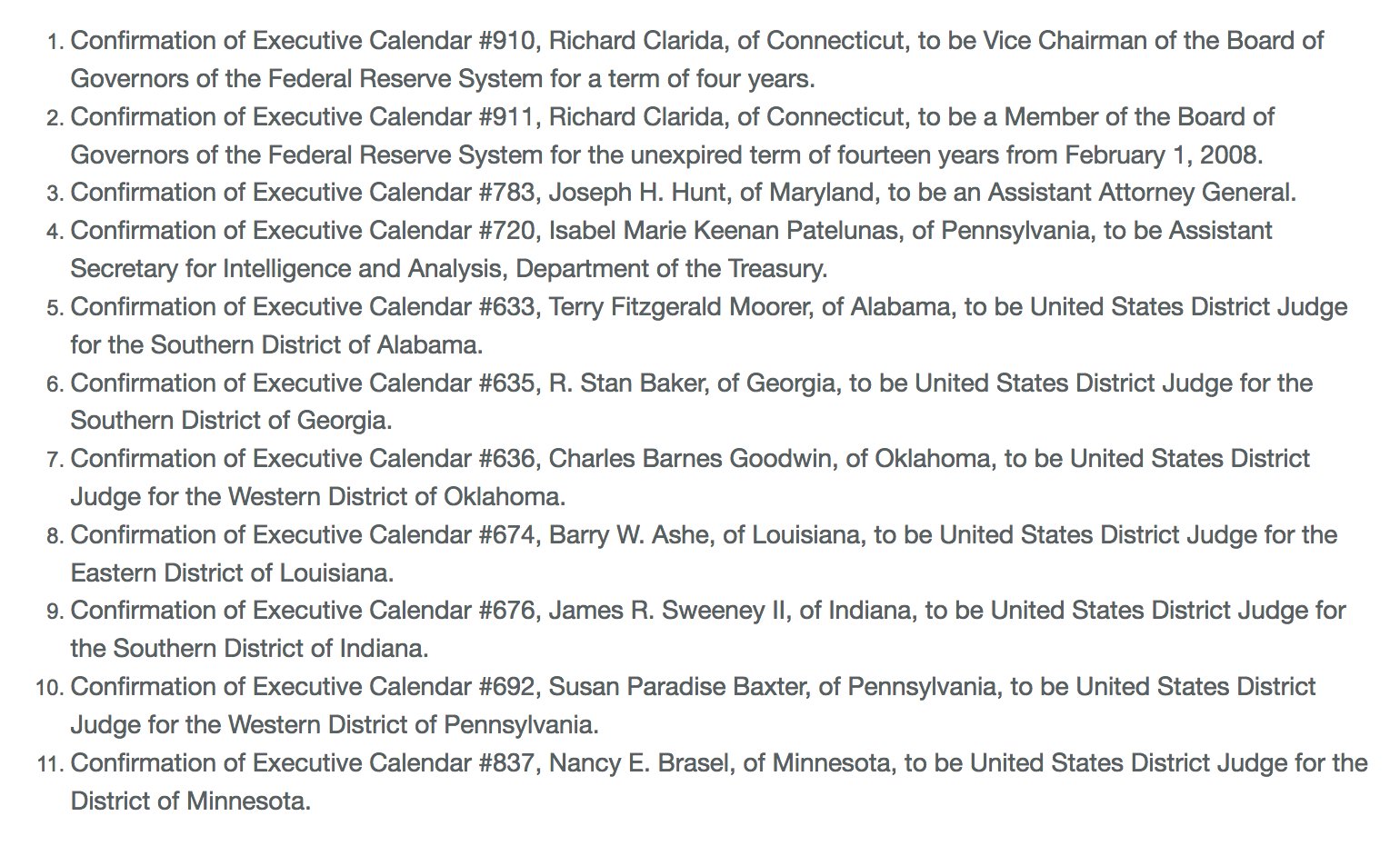 Of the 15 nominees, six were confirmed by voice votes on Tuesday. Another one was confirmed on a recorded vote. The remaining eight will get quick votes next week.