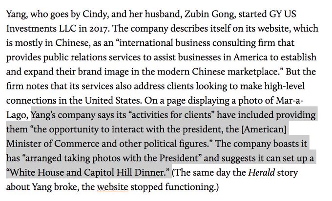Yang’s company is promoting an upcoming event at Mar-a-Lago featuring Trump’s sister, Elizabeth Trump Grau. The co. bills it as “a once-in-a-lifetime publicity opportunity” where "Chinese elites" will have the chance to mingle with Trump Grau and members of Congress pic.twitter.com/5iCxZXqkVA