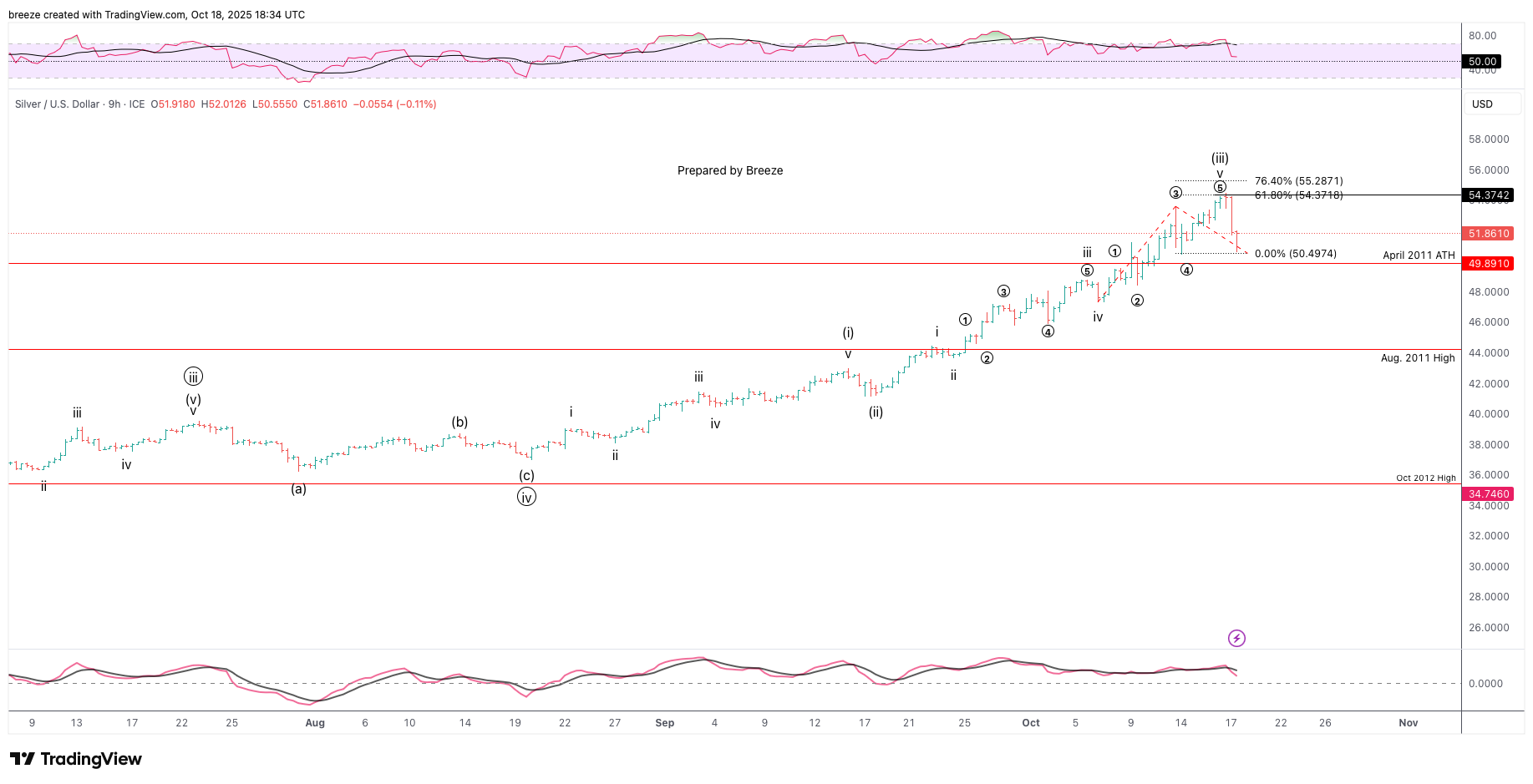 Spot Silver Wave Count. Microwave (circle) 5 of Wave v of Wave (iii) hit my target with a 61.8% price extension. Another Bingo. Wave (iv) is now in play. Will provide a target this weekend. Breeze