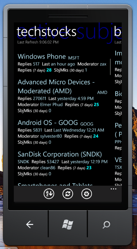 Main screen: New layout to optimize space, includes last refresh time. Fast sort of individual topics. Does not hit SI servers to perform re-sort, unless one explicitly clicks the 'Refresh' icon. In the demo, the Active Subjects list is sorted and then refreshed.