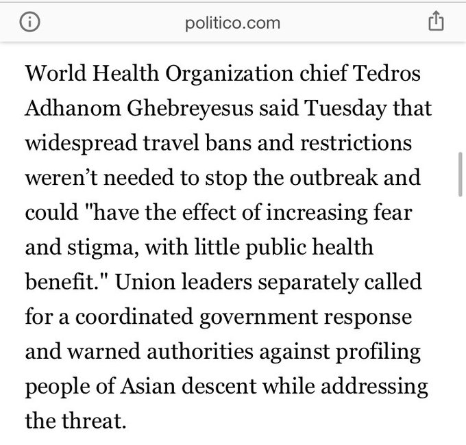 "WHO chief @DrTedros Adhanom Ghebreyesus said Tuesday (Feb 4, 2020) that widespread travel bans and restrictions weren’t needed to stop the outbreak and could 'have the effect of increasing fear and stigma, with little public health benefit.'" - t.co
