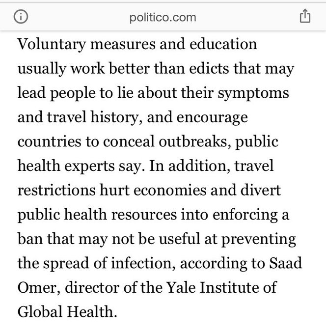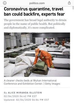 Sun Feb 2, the Trump Admin ordered U.S. travelers to China’s Hubei province to be held in a mandatory quarantine for two weeks, the anti-Trump article by @AliceOllstein at Politico quoted "healths experts" who said this will make it worse because people will hide their symptoms.