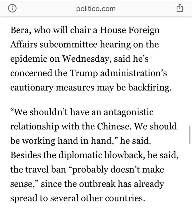The 2/4/20 Politico article by @AliceOllstein quoted Dem @RepBera fully opposing the late Jan/early Feb steps of the Trump Admim! This is paragraph 13 and 14 of the article -- ALL of which were anti the Trump Admin's moves to contain the virus 5 weeks ago.