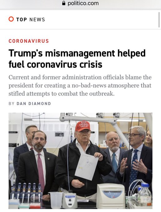lead item now on Politico is an article by @ddiamond headlined "Trump's mismanagement helped fuel coronavirus crisis." Sub: "Current and former administration officials blame the president for creating a no-bad-news atmosphere that stifled attempts to combat the outbreak."