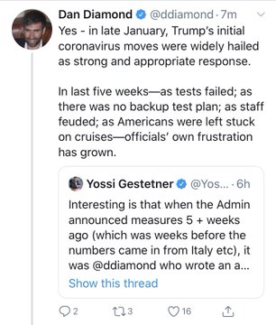 Politico's Dan Dimond tweets now that Trump's "initial coronavirus moves [late Jan] were widely hailed as strong an appropriate response." Um no. Diamond's 1/31/20 article did not praise; it merely gave facts and days later Politico's narrative was that Trump is overreacting.