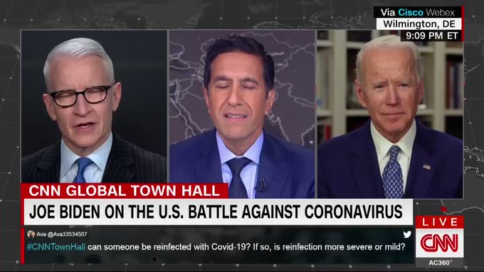 "I wouldn't call it a plan," says Democratic presidential candidate Joe Biden, responding to Pres. Trump's plan to reopen the American economy. "…He's kind of punted. He's decided that he doesn't have the right to make the call for the country." #CNNTownHall
