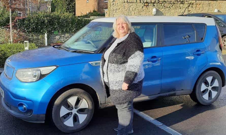 Sue Peachey, 57, with her electric car, which she bought after attending the UK’s first climate assembly. Photograph: Climate Assembly UKNext was to figure out a way to pass on what she had learned at the assembly, during which participants produced recommendations, including a tax on frequent-flyers, a ban on selling SUVs, and a cut in meat consumption.