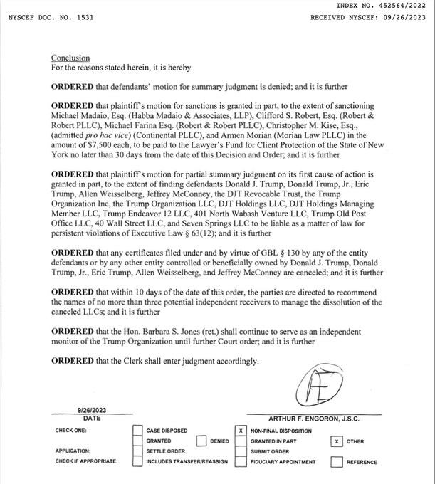 NEW: If I am reading this right,Judge Engoron has found that Donald Trump committed fraud and has ordered the cancellation of all of his New York business certificates and the dissolution of the Trump Organization.