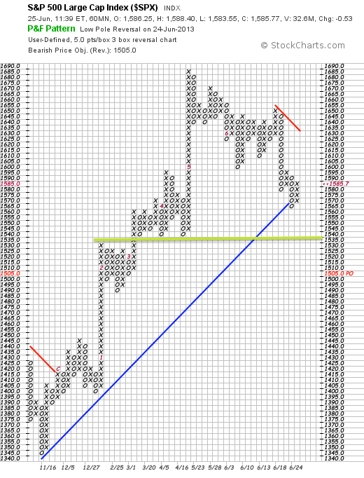 I have included a point and fgure chart of the SPX 500 index which shows that we have had some technical damage done to the uptrend and thus the decline we have seen in US equities is probably not over and we will most likely be looking at a test of the 200 Day Moving Average..... and even a break underneath it after our countertrend really which began on monday plays itself out over the rest of this week, the Holiday shortened ffirst week of July and .... the counter trend rally which should have up days and down days should carry into a secondary lower top probably around Weds. July 17th..... if this scenerio plays out.... people will be feeling quite bullish about US equities at that point and it will make for another excellent opportunity to reduce asset allocation to Equities and risk assets and to increase longer term postioning shorts .