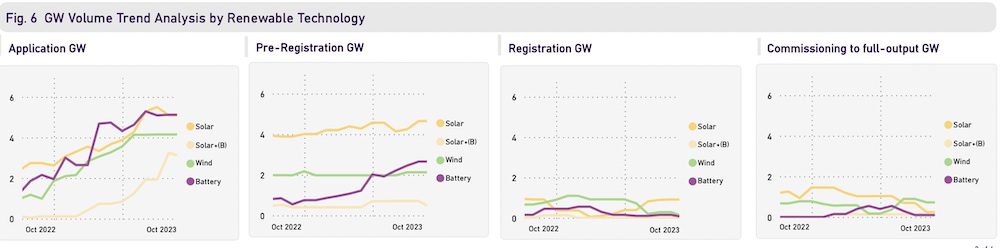 Of particular interest is the big increase in applications from big battery projects, both in number and size, from 14 projects representing 1,860MW in capacity to 22 projects representing 5,100 MW in capacity. The storage duration was not provided and may vary significantly from project to project.