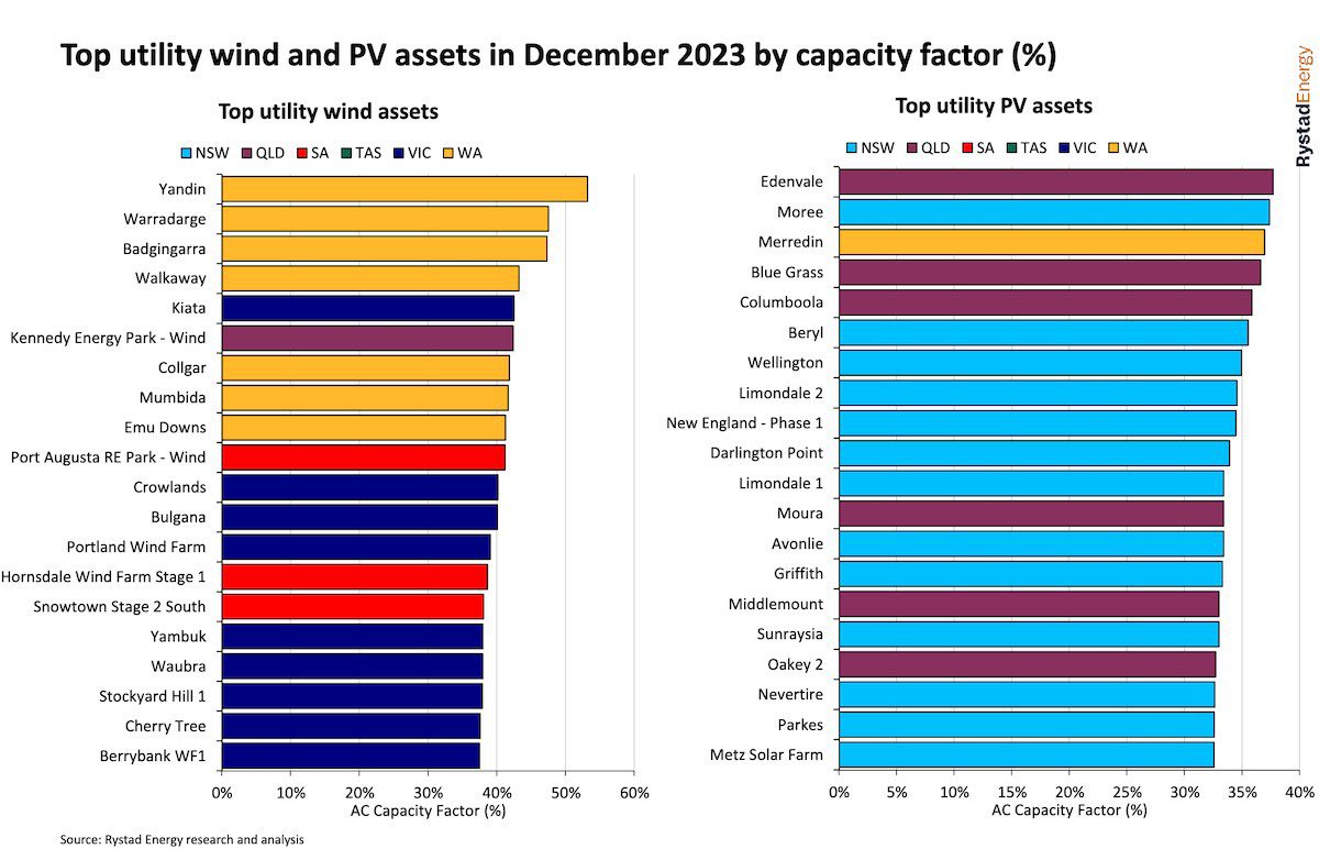 Dixon says the top wind assets for December include WA’s Yandin wind farm (53.2% CF), Warradarge wind farm (47.5% CF) and the Badgingarra wind farm (47.3% CF).