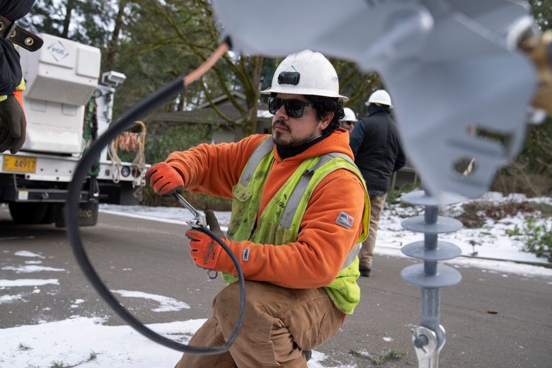 1 of 2 | File – A worker from Portland General Electric replaces a power line as crews work to restore power after a storm on Jan. 16, 2024, in Lake Oswego, Ore. On Friday, Feb. 2, 2024, the U.S. government issues its January jobs report. (AP Photo/Jenny Kane, File)