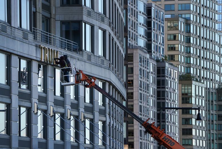 FILE — Following a legal battle, the Trump logo is removed from a condo building on Riverside Boulevard in Manhattan, Oct. 18, 2018. When Donald Trump became president, condominiums in New York buildings emblazoned with his name began... (CHANG W. LEE / NYT)