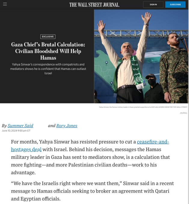 Yahya Sinwar, leader of Hamas, has repeatedly stressed the importance of Palestinian civilian casualties to Hamas’s strategy in negotiations over a ceasefire. He calls them “necessary sacrifices” that will “infuse life into the veins of this nation” and pressure Israel. Just remember when you put the blame on Israel alone you are not standing up for Palestinians, you are playing directly into the strategy of their monstrous leaders, who see their deaths and suffering as nothing more than a ticket to personal gain.