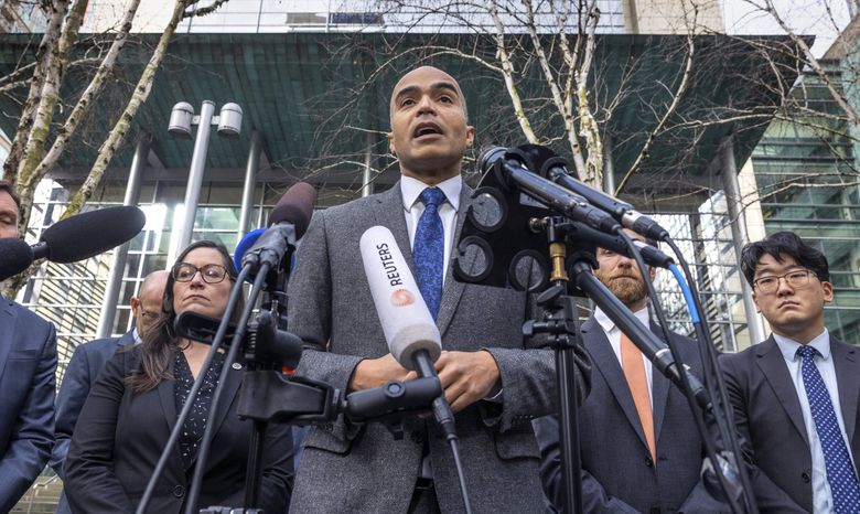 Washington Attorney General Nick Brown spoke outside the federal courthouse in downtown Seattle on Thursday after a federal judge in Seattle has once again blocked the Trump administration’s attempt to rescind birthright citizenship. Brown said the court affirmed that “we do not have a king, we have a president who must abide by the laws.” (David Gutman / The Seattle Times)