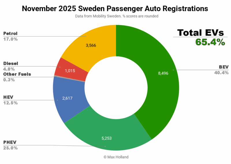 November’s auto sales showed combined plugin EVs at 65.4% share in Sweden, with full electrics (BEVs) at 40.4% and plugin hybrids (PHEVs) at 25.0%. These figures compare YoY against 61.7% combined, 36.3% BEVs and 25.4% PHEVs.