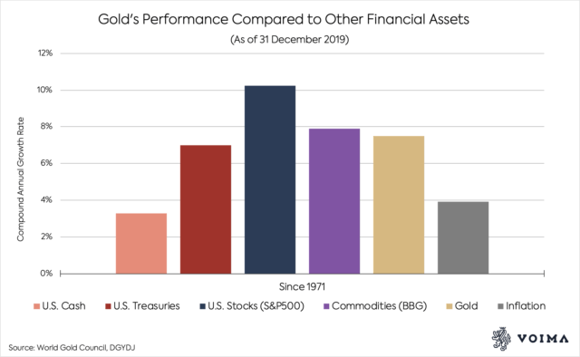 You might think that dollars with interest, for example U.S. government bonds (Treasuries), would have outperformed gold since the gold standard was abandoned in 1971. But this isn't true. Gold has performed better than Treasuries.