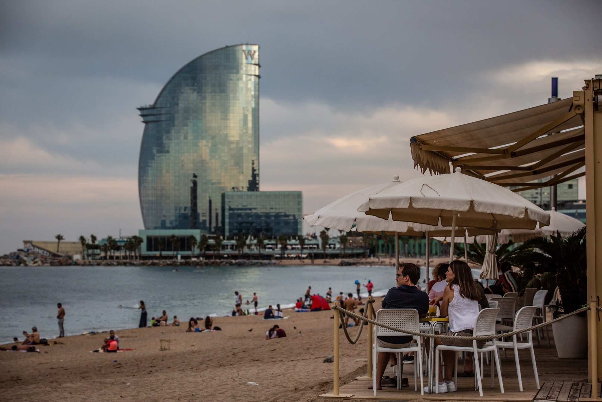 Customers sit outside a beachside bar in Barcelona, Spain, Aug. 18.