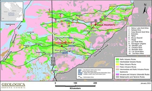 Modified from: Technical Evaluation Report of the Agar Property, Duplessis Township, Abitibi Region, Québec, Canada, for Goldflare Exploration, Géologica Groupe-Conseil. January 21, 2022. Beauregard A-J. (ogq #227), Gaudreault D., Eng. (oiq#39384).