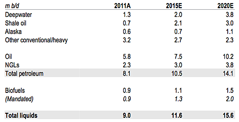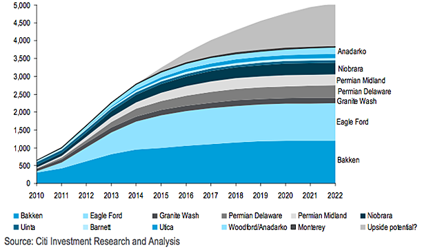And the third source that Citigroup cites are the oil from shale deposits shown at the top of the post. They see growth of 2.4 mbd in oil production and 1.5 mbd in NGLs from the increase in production from natural gas. The production gains are broken down as follows: