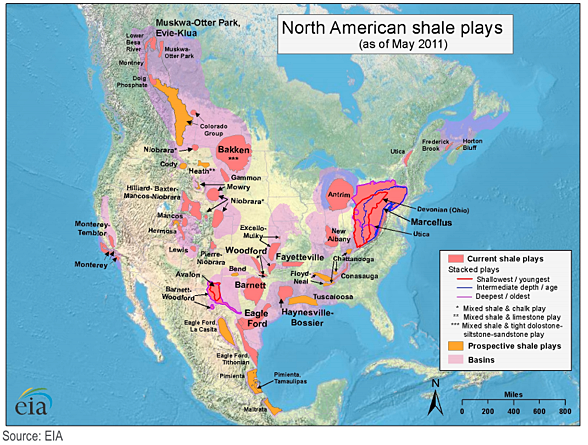 The image projected by the above figure suggests that the country is covered in shale, all waiting to provide its wealth to the nation. But that is not the case and shale plays have been a hot topic for a number of years now. And while the map above shows a carpet of shale that has the potential to produce oil and/or natural gas, it does not clearly enough distinguish the considerable difference between deposits that are presently economic, and those that are not. (The small number of fields that are labelled as prospective does not speak well for the future).