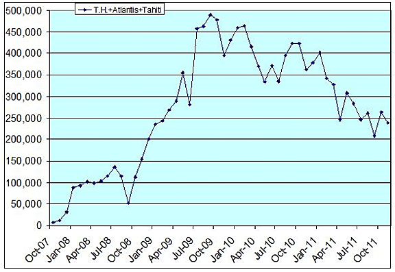 In this context it might be well to remember that as a rule of thumb (from the Russian posts) a 500 mmboe field may produce around 120 kbd. However, it should be noted that some of the GOM fields are having problems reaching their target, and that production is falling at a rate of around 20% per year, as Darwinian showed for the cumulative production of Thunder Horse Atlantis and Tahiti, which were projected to produce 550 kbd in total.