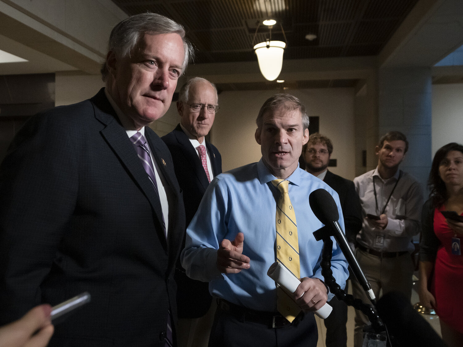 At the top of the list for possible temporary appointments are Republican Reps. Jim Jordan of Ohio and Mark Meadows of North Carolina. The two lawmakers sit on the House Oversight Committee, which is taking part in the closed-door deposition phase of the investigation, but neither lawmaker sits on the House Intelligence Committee, which will lead upcoming public impeachment hearings.