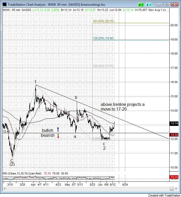 INWK - long 2 from 12.80. Above the 'A' wave low. Trendline resistence is 13.60. Above there 3 up could take us to 20