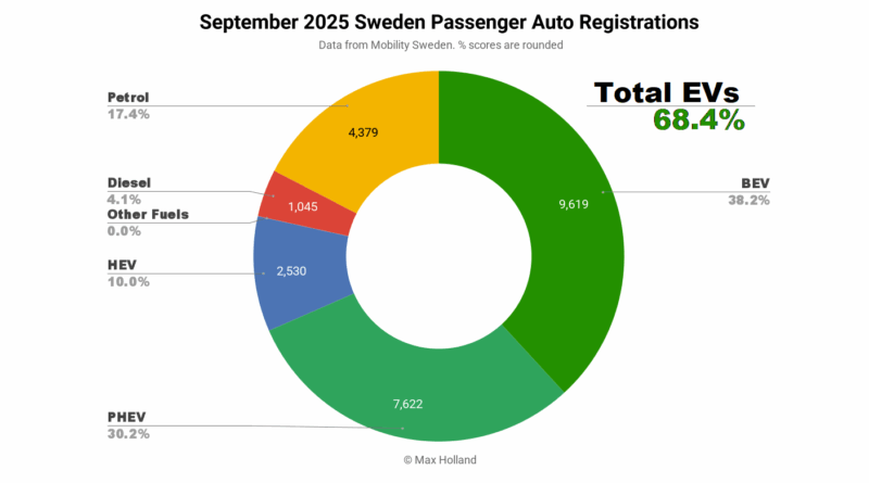 September’s auto sales showed combined plugin EVs at 68.4% share in Sweden, with full electrics (BEVs) at 38.2% and plugin hybrids (PHEVs) at 30.2%. These figures compare YoY against 65.0% combined, 44.8% BEVs and 20.2% PHEVs.