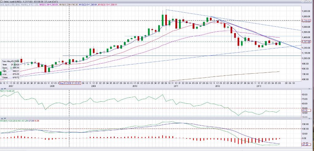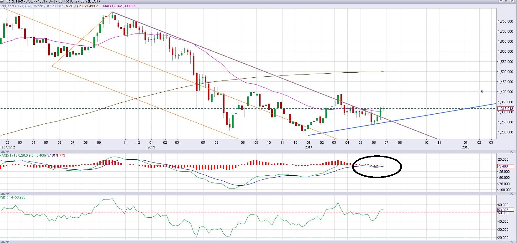 You can see on the weekly gold chart that we have once again crossed above the LT down trend line going all the way back to 11/13 and the MACD has just crossed over which is usually a buy signal. On the monthly chart the MACD is as low as it has ever been on my chart going all the back to 1995 as far back as the Netdania chart goes and is in the process of turning back up.