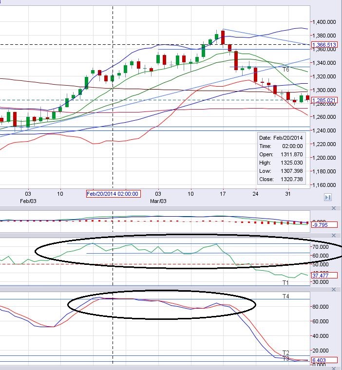 Gold on the other hand although definitely overbought on the daily still has a little room with momentum that seems to have run out. But if I look back to the big move up from February to mid March once gold broke through the 1250/70 region the RSI spent a month floating between 75 on the high side and about 60 on the bottom side until we hit that top. Stochastic also stayed moved side ways for quite sometime.