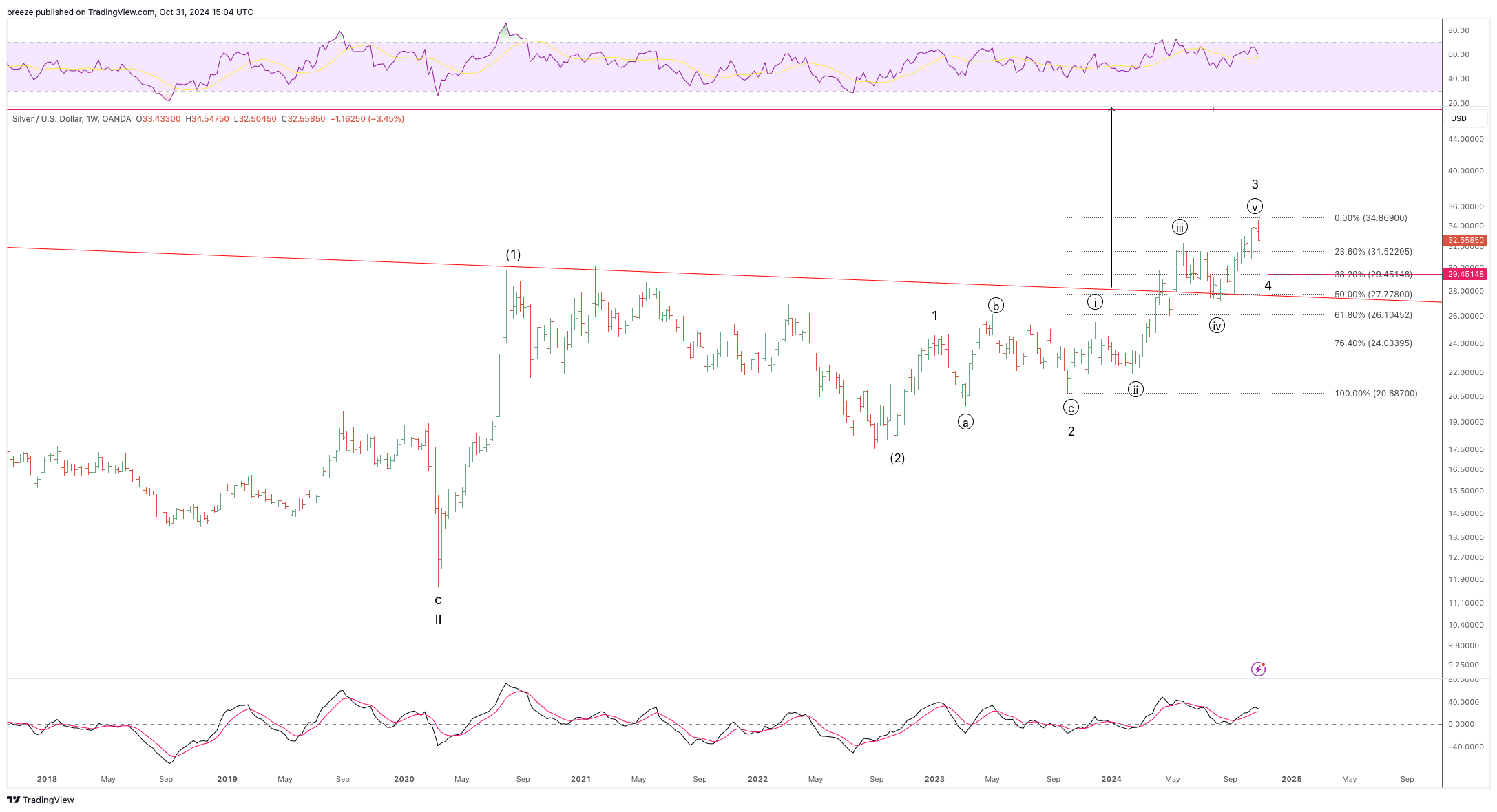 Spot Silver Wave Count Update. Minor Wave 3 is complete. Minor Wave 4 is in play with a target of 29.45. Full moon is on 11/15. Breeze