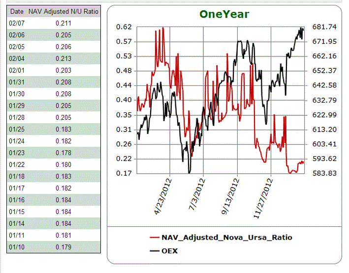 Here is a measure I often look at, the Rydex Nova/Ursa ratio which measures $$ in bull funds vs. bear funds at Rydex vis-a-vis the SPX. Despite the unreal rise in the indices this measure is still floored at .21, meaning funds are allocated to bear funds over bull funds at a ratio of nearly 5 to 1!! Disbelief is a way of life at Rydex