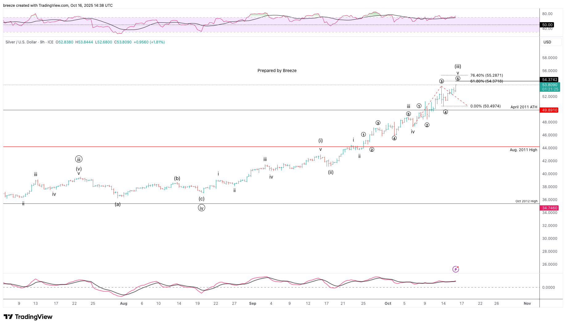 Spot Silver Wave Count Update. Microwave (circle) 5 of Wave v of Wave (iii) is in play with a target range of 54 -55. Breeze