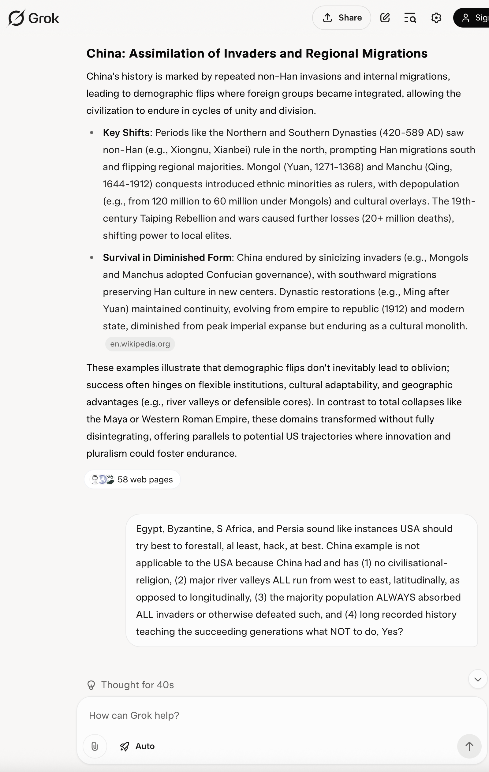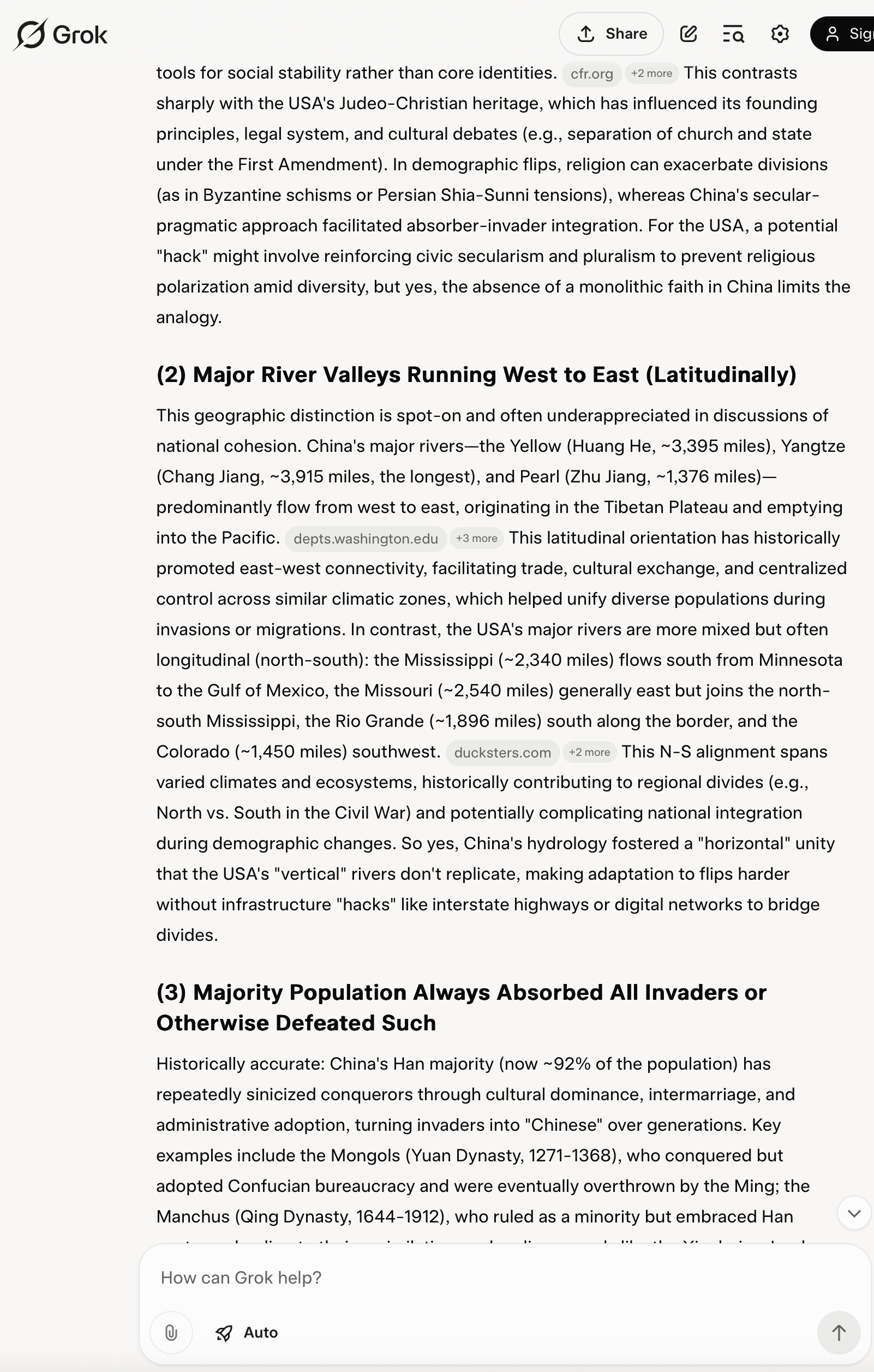 Q: Egypt, Byzantine, S Africa, and Persia sound like instances USA should try best to forestall, al least, hack, at best. China example is not applicable to the USA because China had and has (1) no civilisational-religion, (2) major river valleys ALL run from west to east, latitudinally, as opposed to longitudinally, (3) the majority population ALWAYS absorbed ALL invaders or otherwise defeated such, and (4) long recorded history teaching the succeeding generations what NOT to do, Yes?