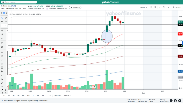 I didn't expect it to move up to the $17.10/20 in one session this quickly on twice the daily volume.  MUX now has a chance to move up to the $21.40/50 area at some point, which takes us back to the August, 28, 2019's high-point, but its also leaving gaps and untested pivots below both on the daily, hourly, and weekly.  Cant bet against this kind of momentum.