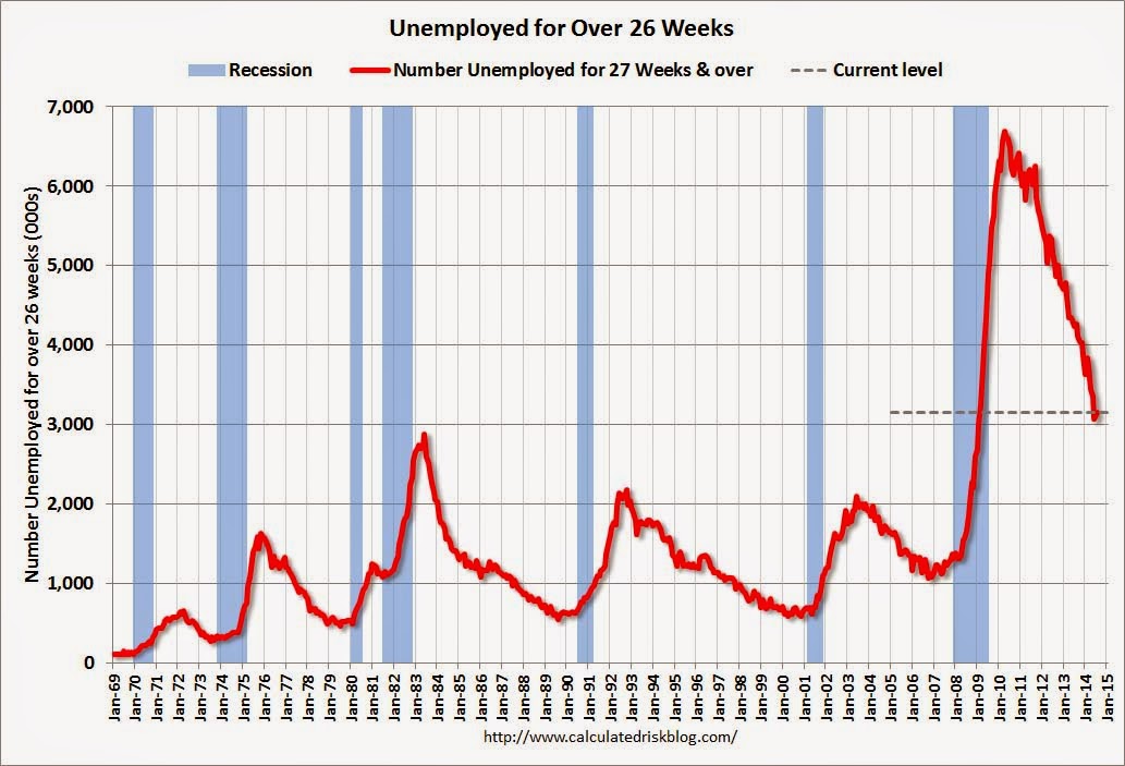 Since the overall participation rate declined recently due to cyclical (recession) and demographic (aging population, younger people staying in school) reasons, an important graph is the employment-population ratio for the key working age group: 25 to 54 years old. In the earlier period the participation rate for this group was trending up as women joined the labor force. Since the early '90s, the participation rate has mostly moved sideways (with a downward drift started around '00) - and with ups and downs related to the business cycle. The 25 to 54 participation rate decreased in July to 80.8%, and the 25 to 54 employment population ratio decreased to 76.6% from 76.7%. As the recovery continues, I expect the participation rate for this group to increase - although the participation rate has been trending down for this group since the '90s. Year-over-year Change in Employment  This graph shows the year-over-year change in total non-farm employment since 1968. In July, the year-over-year change was 2.570 million jobs, and it generally appears the pace of hiring is increasing. Right now it looks possible that 2014 will be the best year since 1999 for both total nonfarm and private sector employment growth. Part Time for Economic Reasons