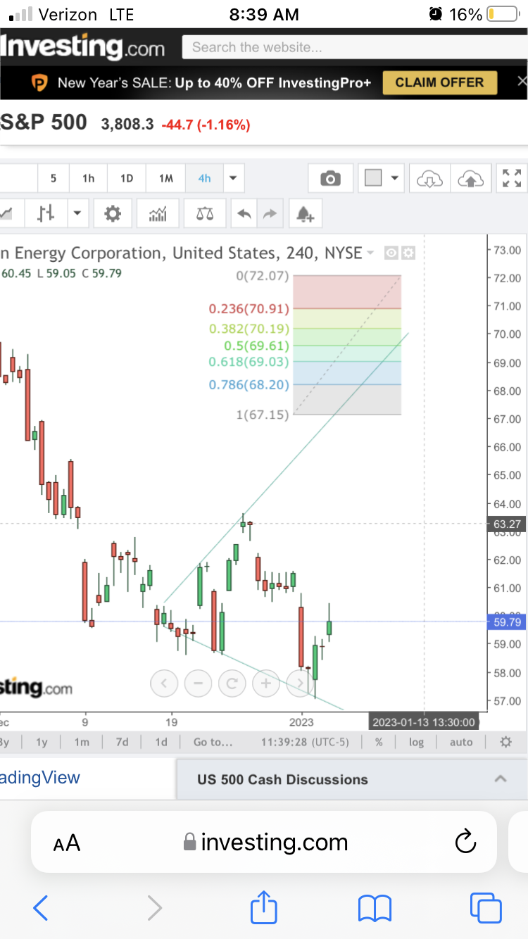 Patternwise, DVN is within an active megaphone, and is looking for the 5th touch near 67. A subsequent breakout from the megaphone in that area would yield a target of roughly 72 prior to HARSH reversal. That would fall shy of wave 3 of C’s peak, resulting in a truncated 5th.