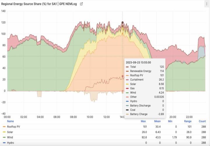 At the time, renewables contributed around 114 per cent of the state’s demand, exporting most of the excess while some went into storage, and a significant amount was curtailed due to negative prices. The new milestone beat the previous peak for rooftop solar of 99.2 per cent recorded a week earlier.