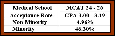 Perhaps the AAMC wishes to make the comparisons of acceptance rates by ethic groups harder, because the results above are pretty dramatic, and maybe this is what it is trying to hide? This just one example: for those applicants with a MCAT of 24-26 and GPA of 3.00-3.19, fewer than one out of 20 non-minorities will be accepted, while almost one out of two minorities will be admitted.