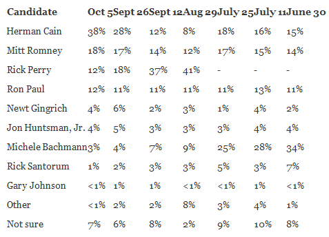 My Comments: Cain was in a statistical tie with Romney in July before Perry entered the race. In August, Cain lost 10% and Romney lost 5% when Perry surged to 41%. As Perry has declined, Cain is building momentum again and today is ahead of Romney 20% who has returned to 18% which is 1% higher than his July support before Perry.