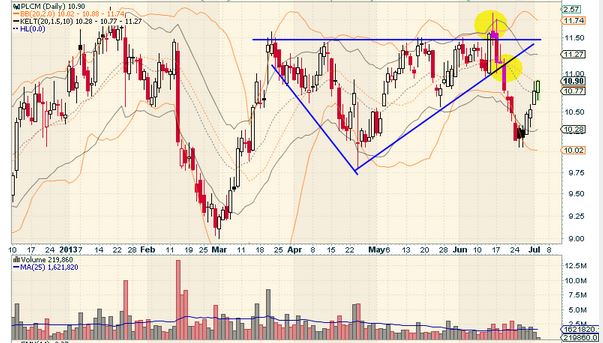 PLCM - failed break out, I deleted it as soon as it broke that up trending line around 11 which is retesting it now: