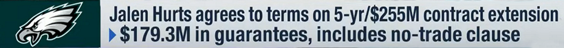 Hurts' deal has $179.304 million in total guarantees, including $110 million fully guaranteed at signing and $126.5 million fully guaranteed by March 2024, as well as the first no-trade clause in Eagles history -- another sign of the franchise's faith in Hurts, who is still only 24 years old.